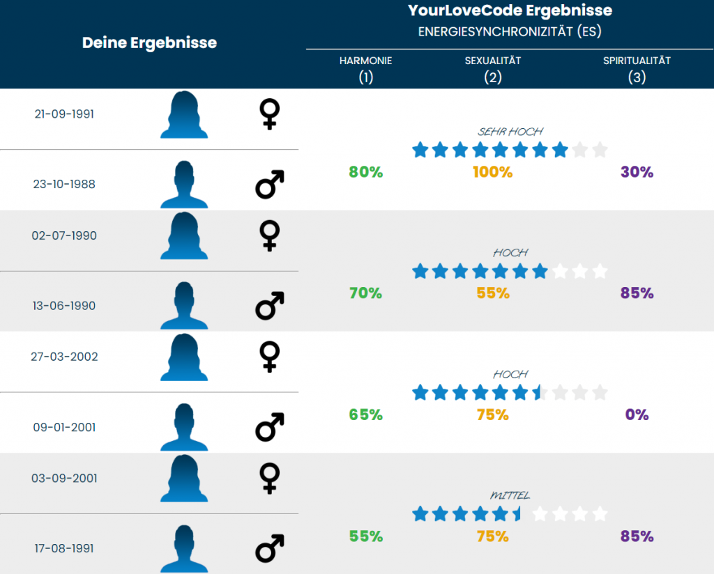 Nach der Eingabe der Geburtsdaten erhalten Sie das Ergebnis der Energiesynchronizität (ES), berechnet auf Basis von 58 Algorithmen, die Dutzende von Vergleichen pro Sekunde durchführen.