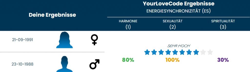 Das Harmonieergebnis stellt das wichtigste Ergebnis für die Erfolgsprognose einer Beziehung dar. Ein hohes Ergebnis weist auf eine hohe Wahrscheinlichkeit der richtigen Zusammengehörigkeit und auf einen hohen Fluss harmonischer Energie hin.