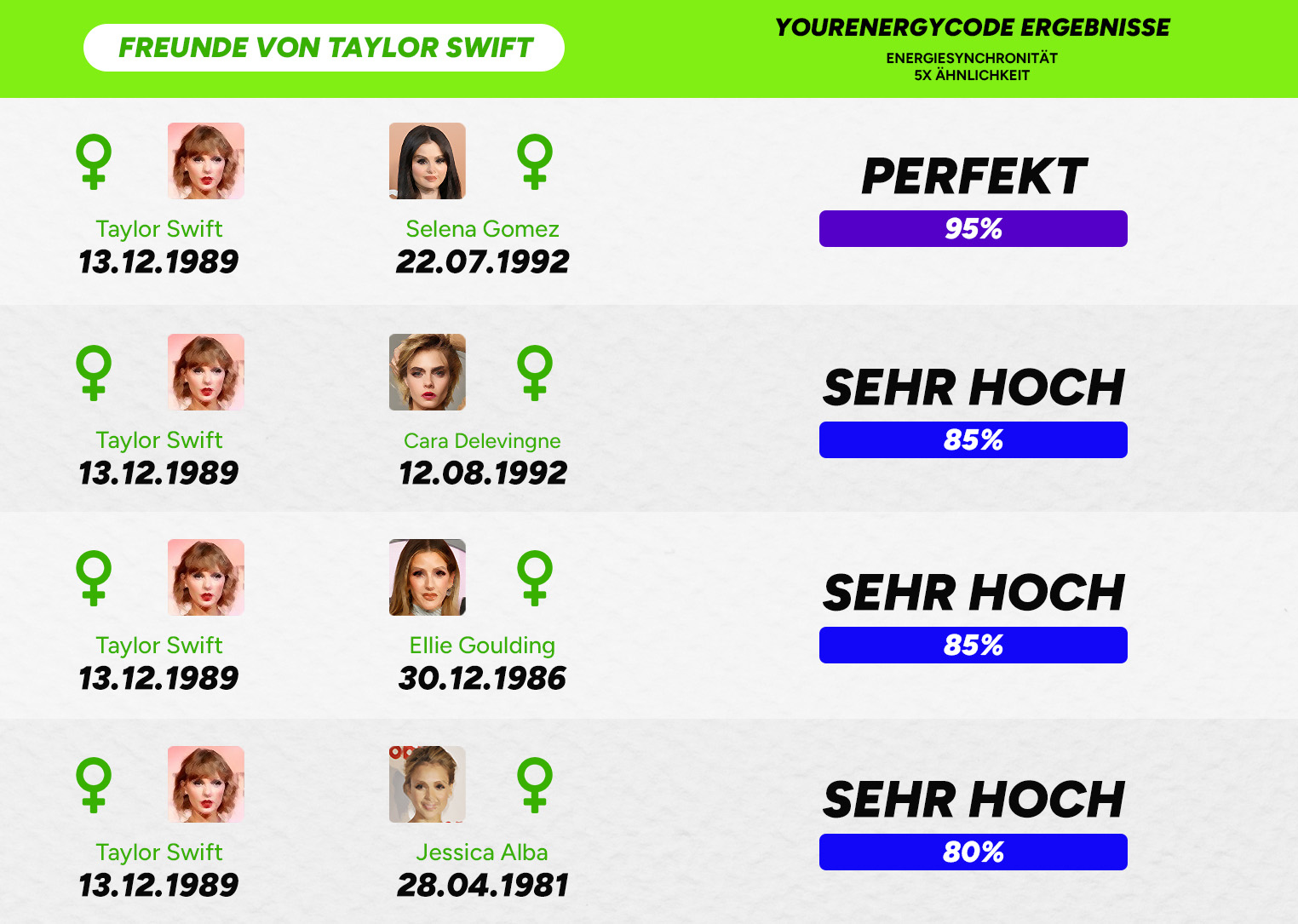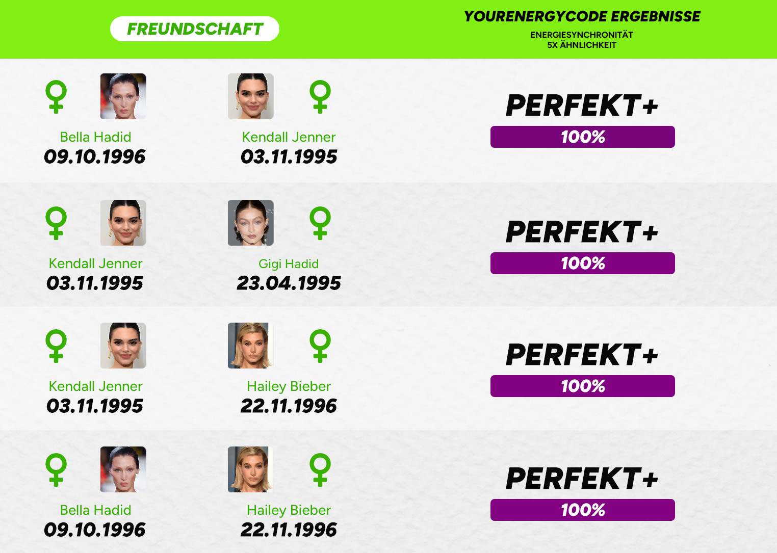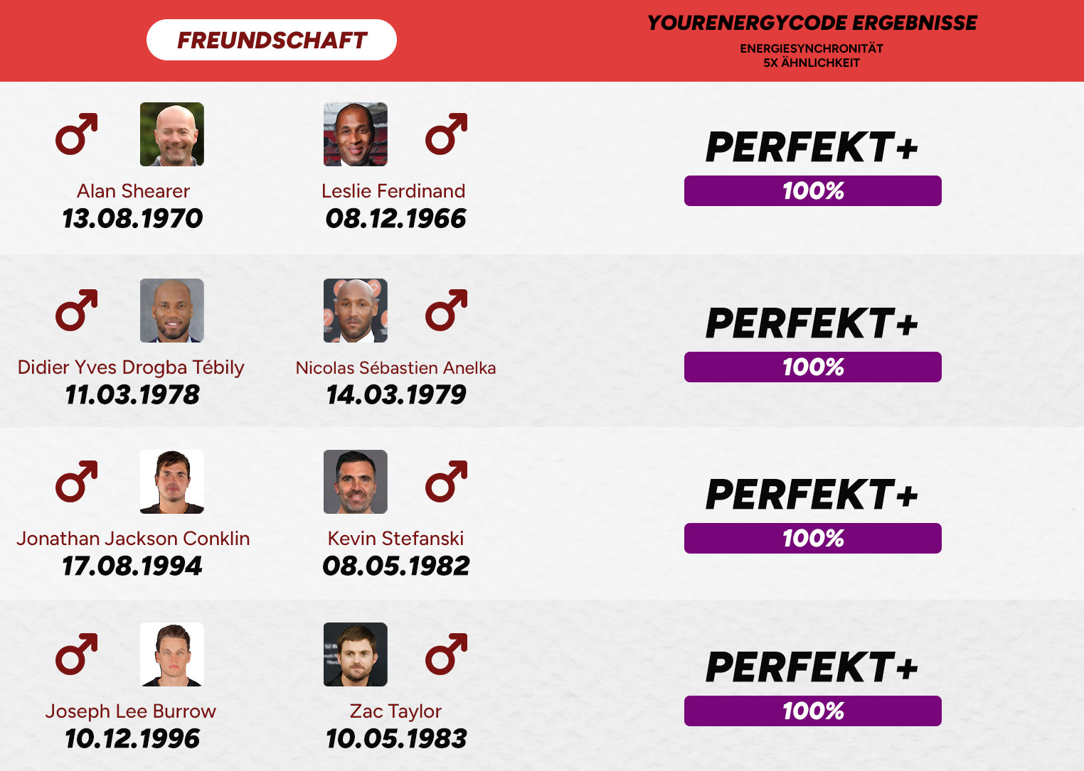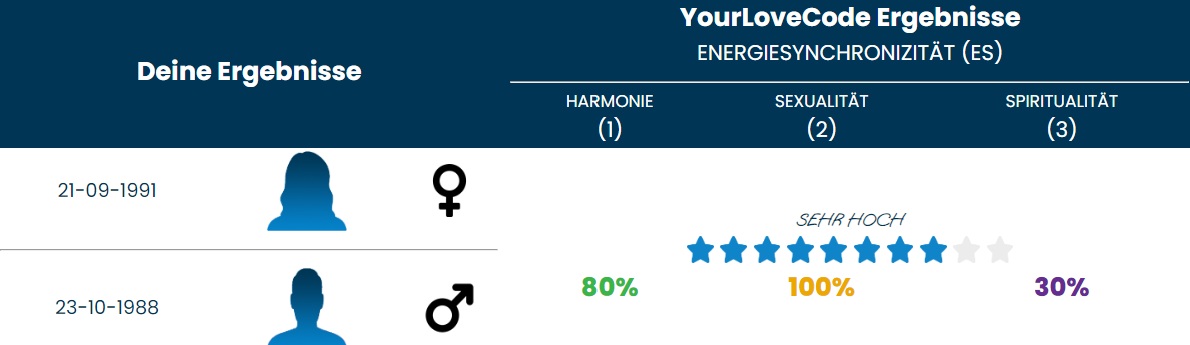 Nach der Auswertung der Synchronizitäts-Energie (SE)-Ergebnisse von mehreren Tausend Tests bei Menschenpaaren aus den Bereichen Business, Film, Sport und Allgemeinleben stellten wir fest, dass tiefe Freundschaften mit Liebe ohne Sex vergleichbar sind. Wir haben daraufhin unsere YourLoveCode-Algorithmen entsprechend angepasst, indem wir unter anderem bei der Bewertung der Sexualenergie andere Maßstäbe gesetzt haben.