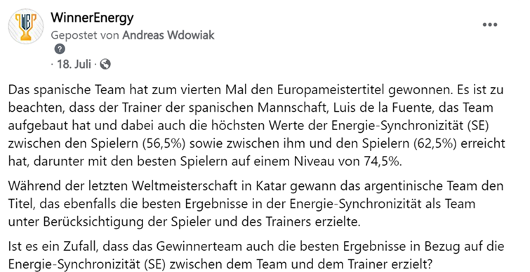 Das Ergebnis eines Mannschaftsspiels, z.B. im Fußball, genau zu prognostizieren, ist schwierig. Die Qualität der Spieler, des Trainers und der Taktik sind natürlich sehr wichtig. Häufig wird jedoch der Aspekt unterschätzt, den wir als Winner Energy bezeichnen. Dabei handelt es sich um das Level der synchronen Energien einer Mannschaft/eines Individuums an einem Spieltag. Wir bieten interessierten Nutzern, z.B. Journalisten, ein unverbindliches Tool an, mit dem sie den Faktor „Teamspirit“ in ihre Gewinnprognose einbeziehen können.