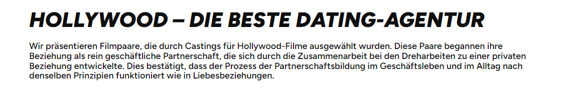 „Es hat sich herausgestellt, dass die von den Medien seit 100 Jahren kultivierten Schönheitsideale, die wir alle als wahr annehmen, in Wirklichkeit die realen Bindungsmechanismen zwischen Menschen verfälschen, da diese ganz anders funktionieren. Es ist an der Zeit, die negativ wirkende Erzählung über die Schönheit eines Menschen an die wahre Wirklichkeit anzupassen.“