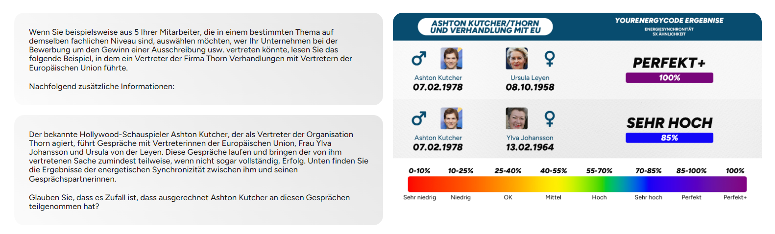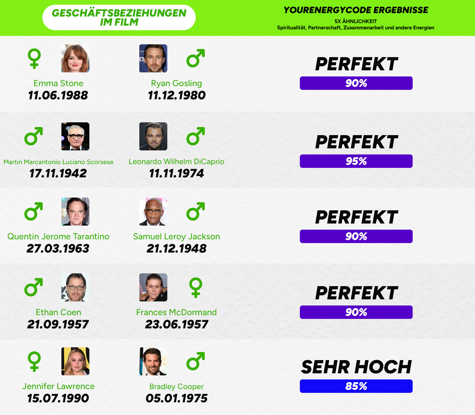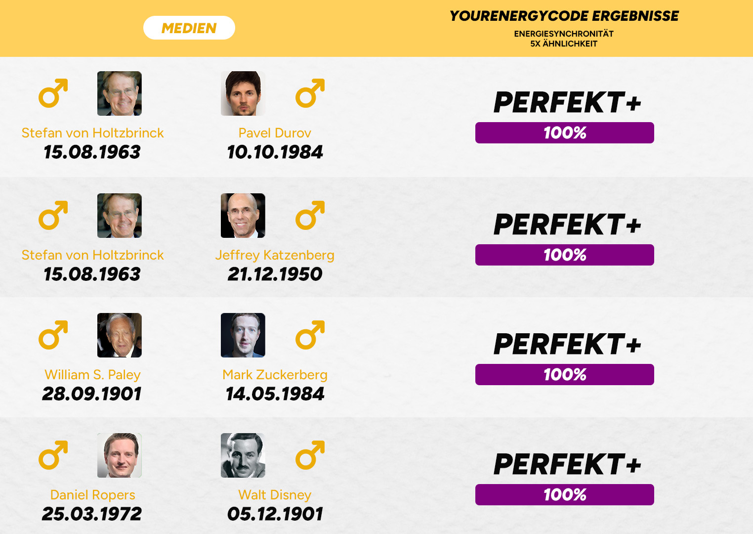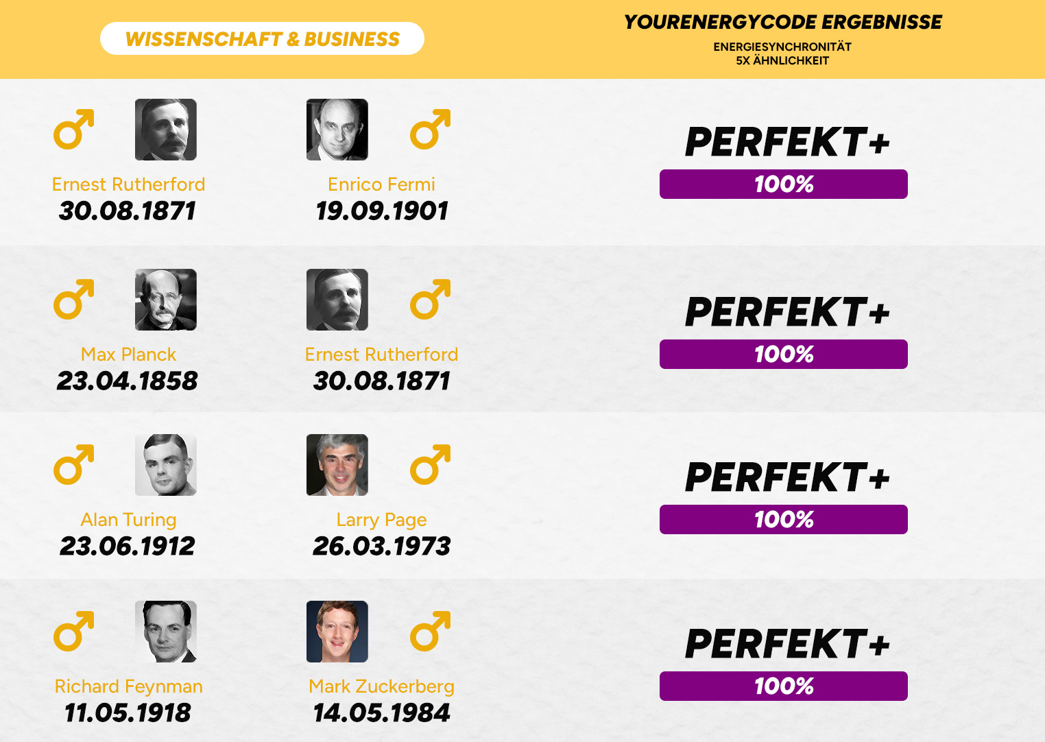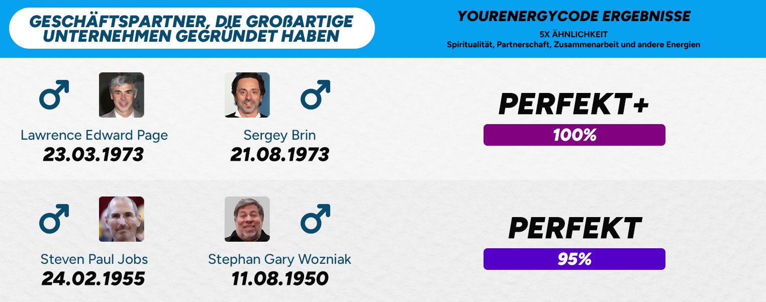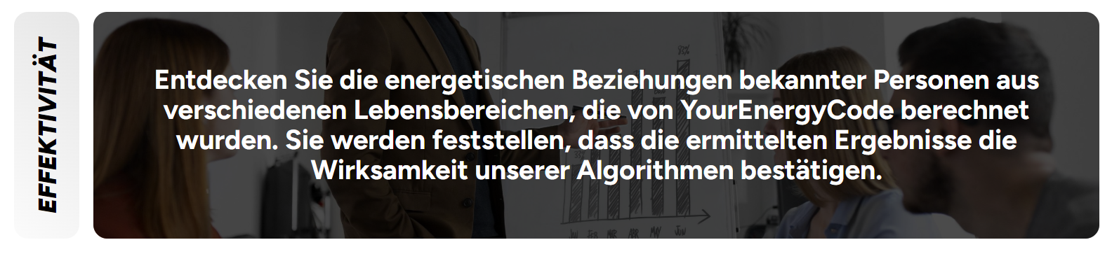 Während der Arbeit an unseren Algorithmen hat jemand aus unserem Team ein Zitat von Elon Musk gelesen: „Ich brauche keine Menschen in meinem Leben, die mir nur Energie rauben, anstatt welche zu geben.“ Dies führte uns zu der Frage, welchen Einfluss das Ergebnis der Synchronizitäts-Energie (SE) von Menschenpaaren, die nicht in einer potenziellen oder direkten Liebesbeziehung stehen, auf den Erfolg im Geschäfts- und Alltagsleben hat.