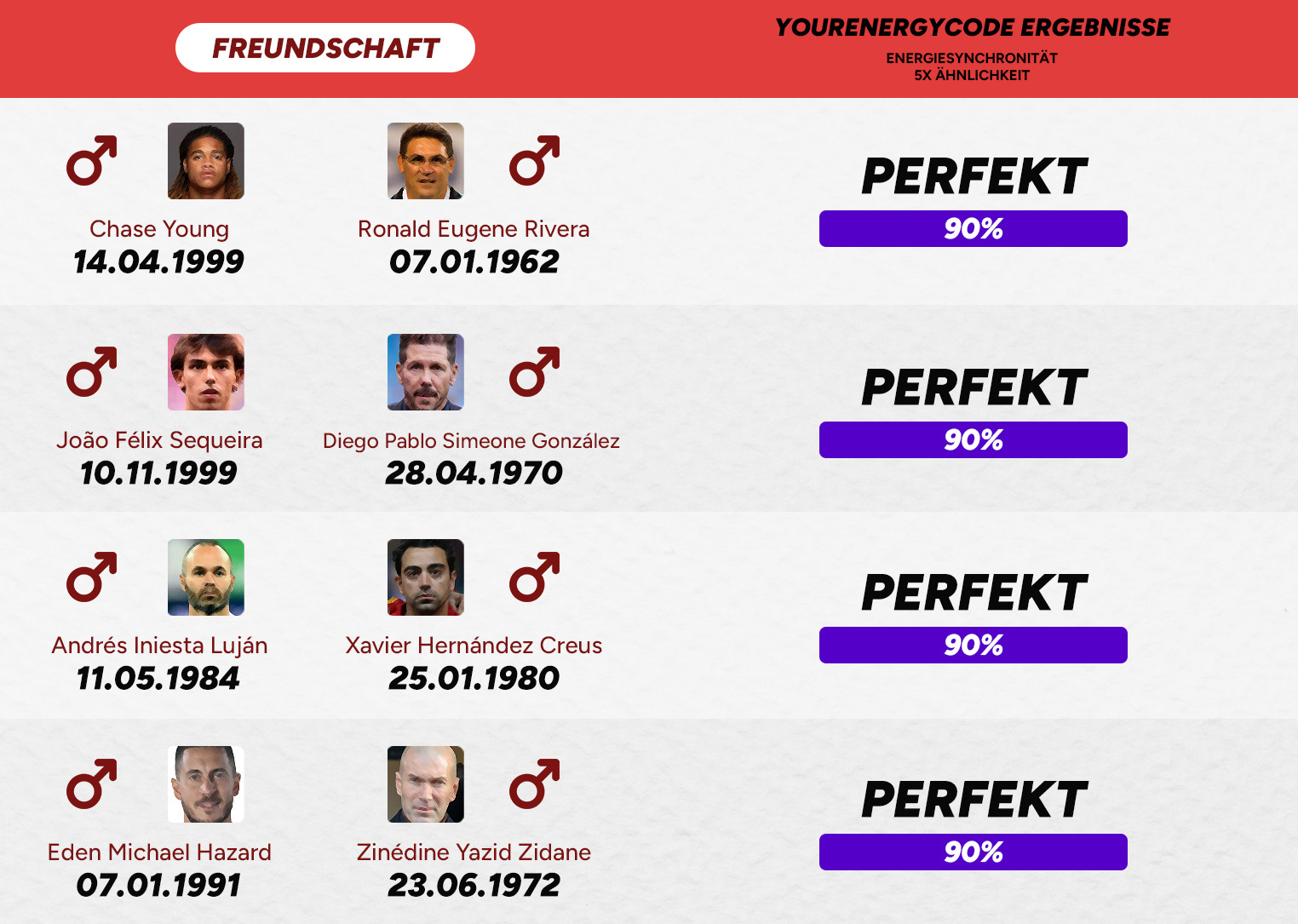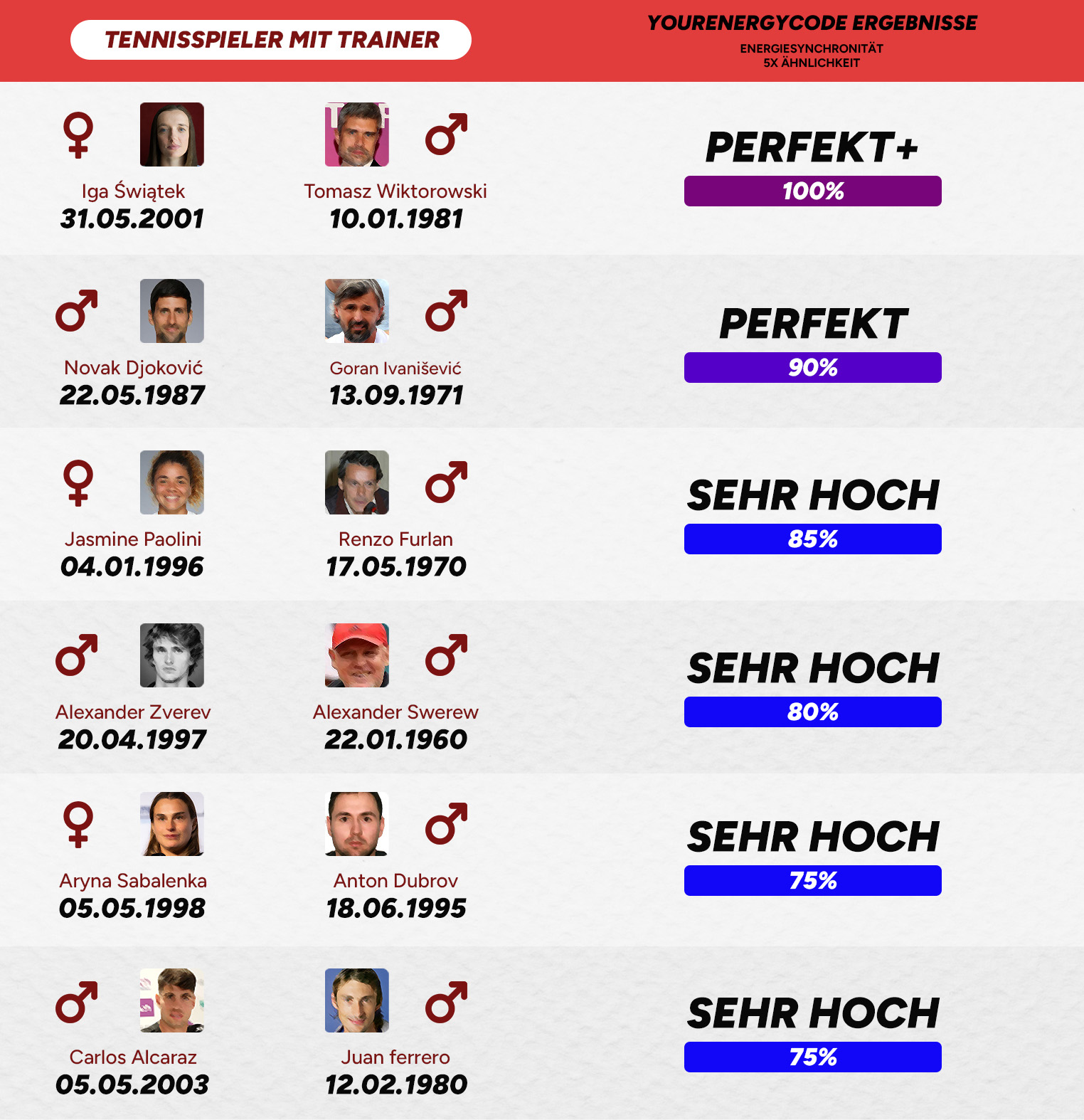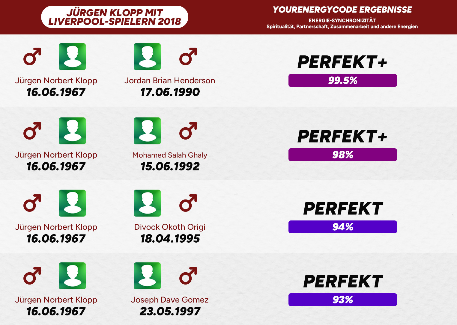 Das bedeutet, dass oft nur Kleinigkeiten über ein gewonnenes oder verlorenes Spiel entscheiden. Genau aus diesem Grund haben wir einen Harmonietest, auch Synchronizitätstest genannt, entwickelt. Das Wort wurde durch den Nobelpreisträger Wolfgang Pauli populär. Unser Test kann einen Energieabgleich zwischen den Spielern und dem Trainer durchführen. Darüber hinaus bewerten wir auch die Tagesform auf Basis des Biorhythmus. Das bedeutet, dass wir diese Werte mit konkreten Zahlen präsentieren.