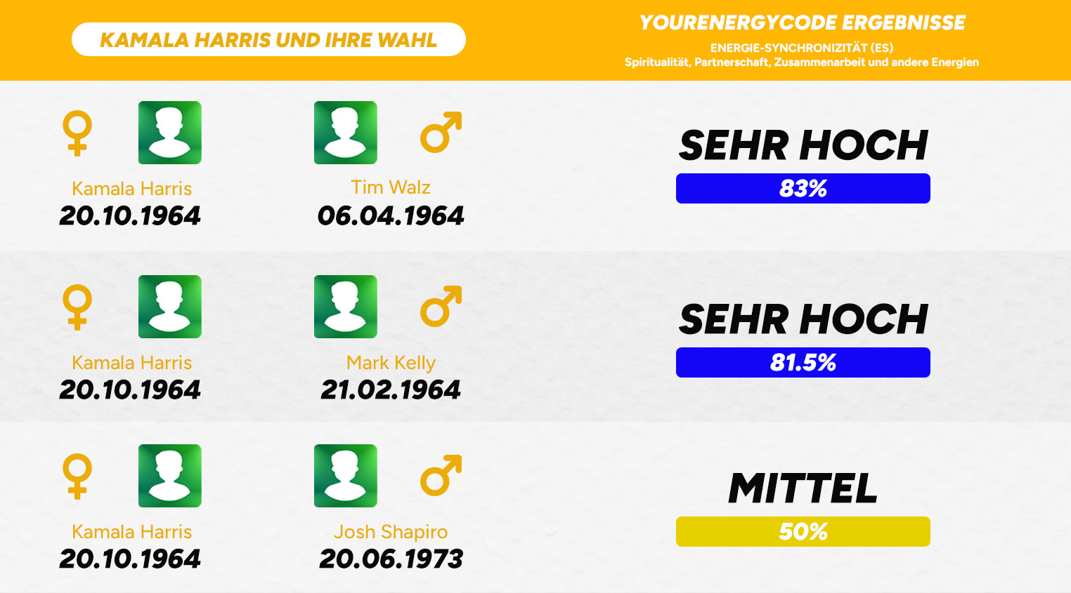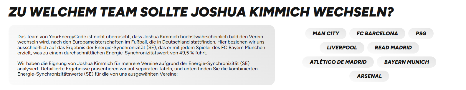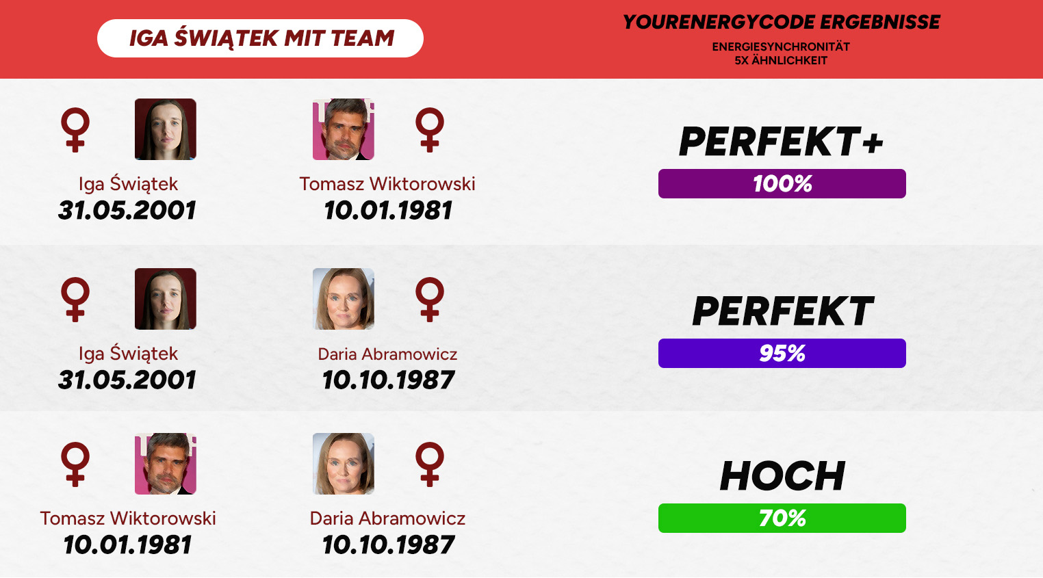 Das bedeutet, dass oft nur Kleinigkeiten über ein gewonnenes oder verlorenes Spiel entscheiden. Genau aus diesem Grund haben wir einen Harmonietest, auch Synchronizitätstest genannt, entwickelt. Das Wort wurde durch den Nobelpreisträger Wolfgang Pauli populär. Unser Test kann einen Energieabgleich zwischen den Spielern und dem Trainer durchführen. Darüber hinaus bewerten wir auch die Tagesform auf Basis des Biorhythmus. Das bedeutet, dass wir diese Werte mit konkreten Zahlen präsentieren.