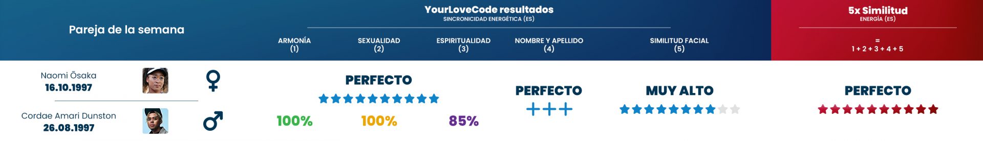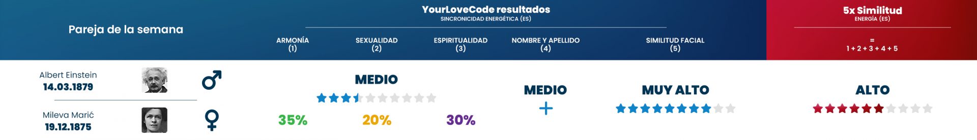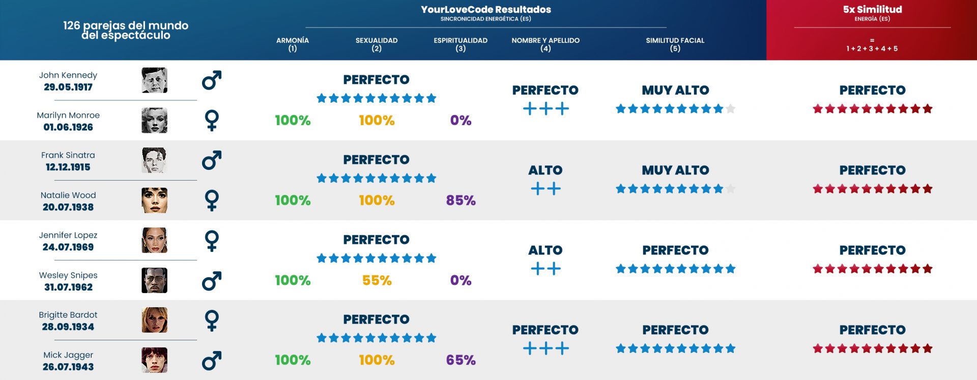 También podría interesarte saber que publicamos semanalmente los resultados de la Energía de Sincronización (SE) de parejas famosas divididos en las siguientes categorías: