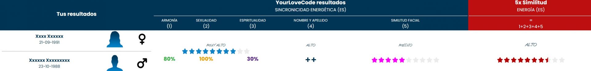 Después de evaluar los resultados de la Energía de Sincronización (SE) de varios miles de pruebas en parejas de los ámbitos de los negocios, el cine, el deporte y la vida cotidiana, descubrimos que la amistad profunda se puede comparar con el amor sin sexo. Luego adaptamos nuestros algoritmos de YourLoveCode en consecuencia, estableciendo, entre otras cosas, diferentes estándares para evaluar la energía sexual.