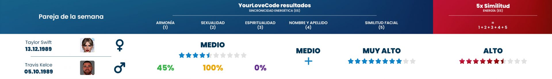 Los rumores sobre la relación entre la artista y el jugador de fútbol americano aparecieron en Internet durante el verano, y la presencia de Taylor en el partido de Travis Kelce el 24 de septiembre, donde la cantante le animaba públicamente, causó un gran revuelo online. Aunque ninguno de los dos ha confirmado si son oficialmente pareja o no, los fans de la artista la apoyan entusiastamente en su nueva relación, ¡y los algoritmos de YourLoveCode también confirman que vale la pena darle una oportunidad a esta relación!