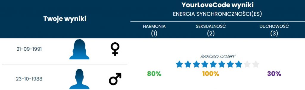 Po wprowadzeniu dat urodzenia otrzymasz wynik Synchroniczności Energii (ES) wyliczony w oparciu o 58 algorytmów, wykonywujących dziesiątki porównań na sekundę.