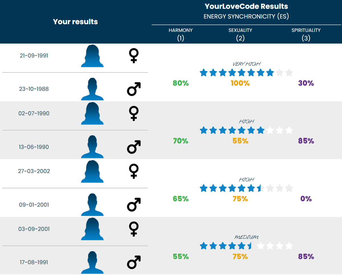 After entering the birth dates, you will receive the Energy Synchronicity (ES) result calculated based on 58 algorithms performing dozens of comparisons per second.